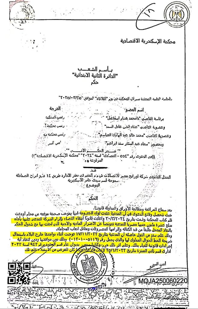 أصدرت محكمة الإسكندرية الاقتصادية حكماً تاريخياً في الدعوى رقم 454 لسنة 2024، بإلزام شركة “أورنج مصر للاتصالات” بدفع تعويض مادي وأدبي قدره 10 ملايين جنيه لمشتركة، إثر تعرض خطها الهاتفي للاستيلاء وتسهيل اختراق حسابها على تطبيق “واتساب”.
